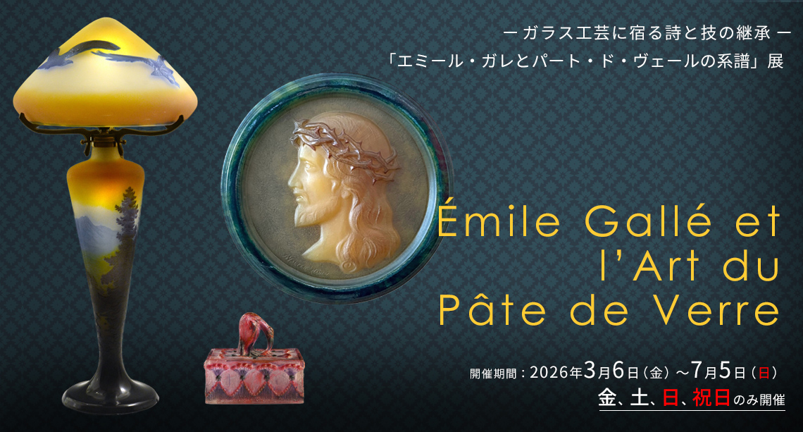 本展では、アール・ヌーヴォーを代表するガラス工芸家エミールガレの作品と共に、パート・ド・ヴェール技法を用いて独自の表現を追求した作家たちの作品もご紹介します。ガレは、植物や昆虫など自然界のモチーフに詩情を重ね、ガラスという素材に哲学的な思想…